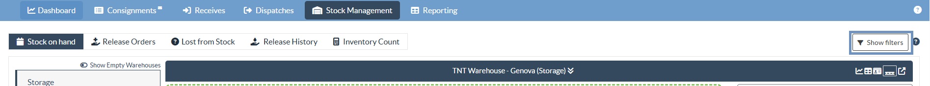 Show Filter: This feature allows users to filter consignments more efficiently by applying criteria such as Consignment Number, Organization, Service Type, or Keyword Search. When activated, the filter tab expands at the top of the screen, enabling users to quickly narrow results and locate specific consignments or items within a warehouse.