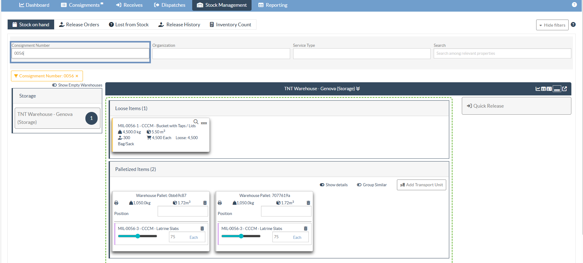 For example, filtering with consignment number 0056 in the screenshot below- RITA operators can see only matching loose items and palletized items for the consignment 0056 in stock. You can add additional filters to refine further; filters can be combined.