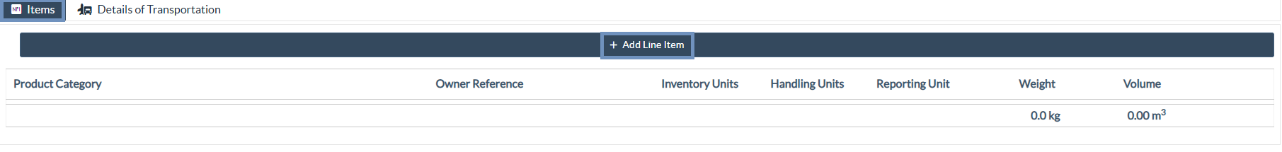 Add Line Item: Once the consignment is saved, the “Add Line Item” button will appear under the Items tab. Click this button to enter detailed cargo information for the consignment.
