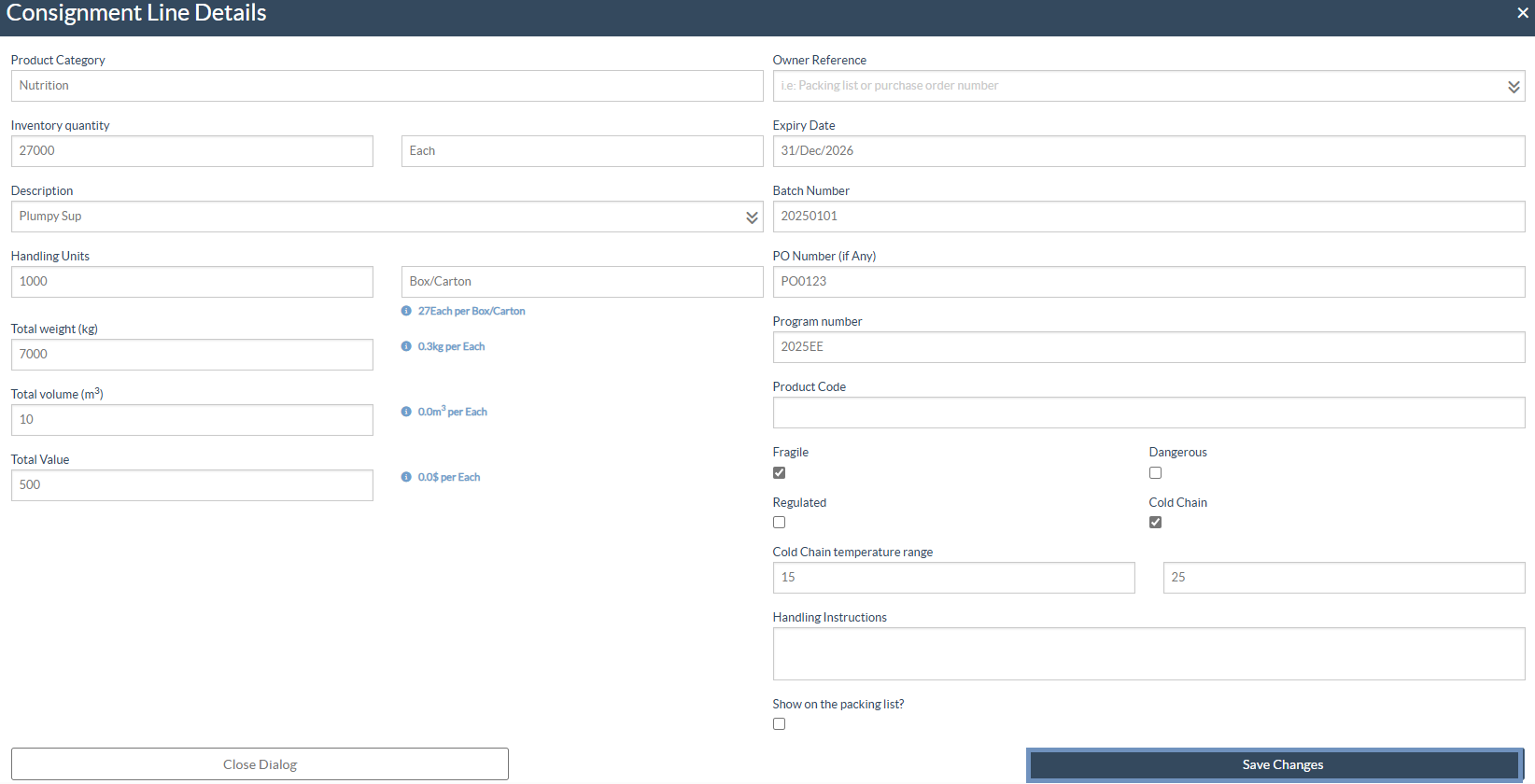 Step2: When selected, a dialog box titled “Consignment Line Details” will open. Within this window, the operator must fill in all relevant cargo details in the same format used in the Service Request Form (SRF). This includes Product Category, Inventory Units and Quantity, Item Description, Handling Units and Quantity, Weight and Volume, Owner Reference (E.g., Packing list number), Batch Number, Program Number, and Product Code (If any), and the special handling instructions, such as Fragile, Dangerous, or Cold Chain items (with the option to define a temperature range)