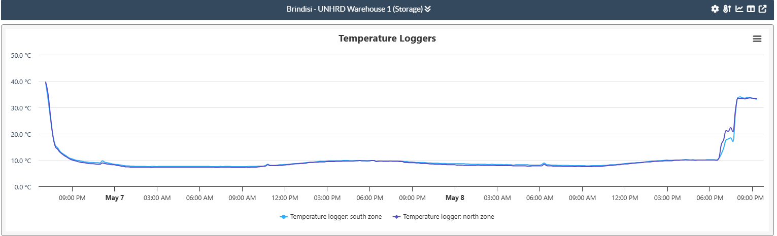 Les deux graphiques sont accessibles à l'aide du menu d'icônes situé dans le coin supérieur droit de l'écran de gestion des stocks, ce qui permet de passer rapidement de l'affichage des enregistreurs de température à celui de l'utilisation de l'entrepôt.